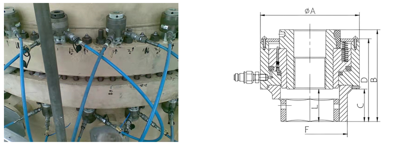 • 緊湊、可靠的拉伸器,液壓拉伸器采用的密封圈都經(jīng)機械加工,密封可靠性強,長期使用也不會導(dǎo)致機械失效;