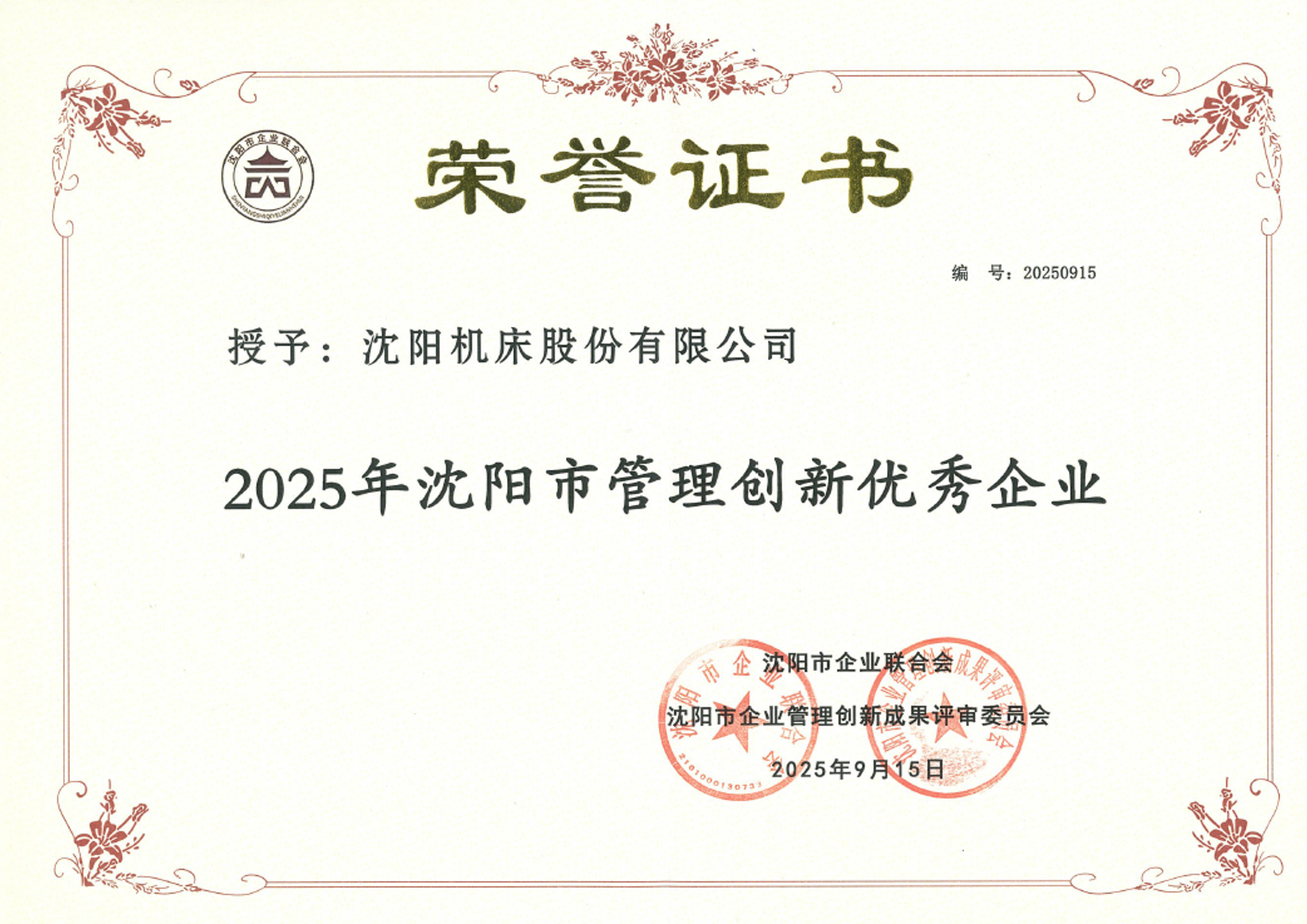 近日,通用技術(shù)沈陽(yáng)機(jī)床獲評(píng)“2025年沈陽(yáng)市管理創(chuàng)新優(yōu)秀企業(yè)”。